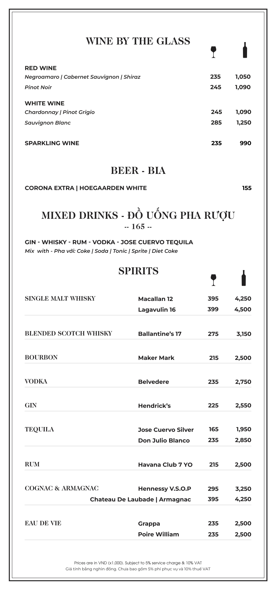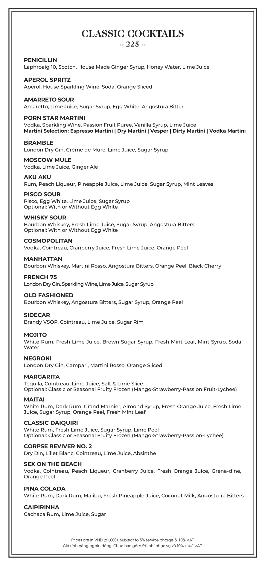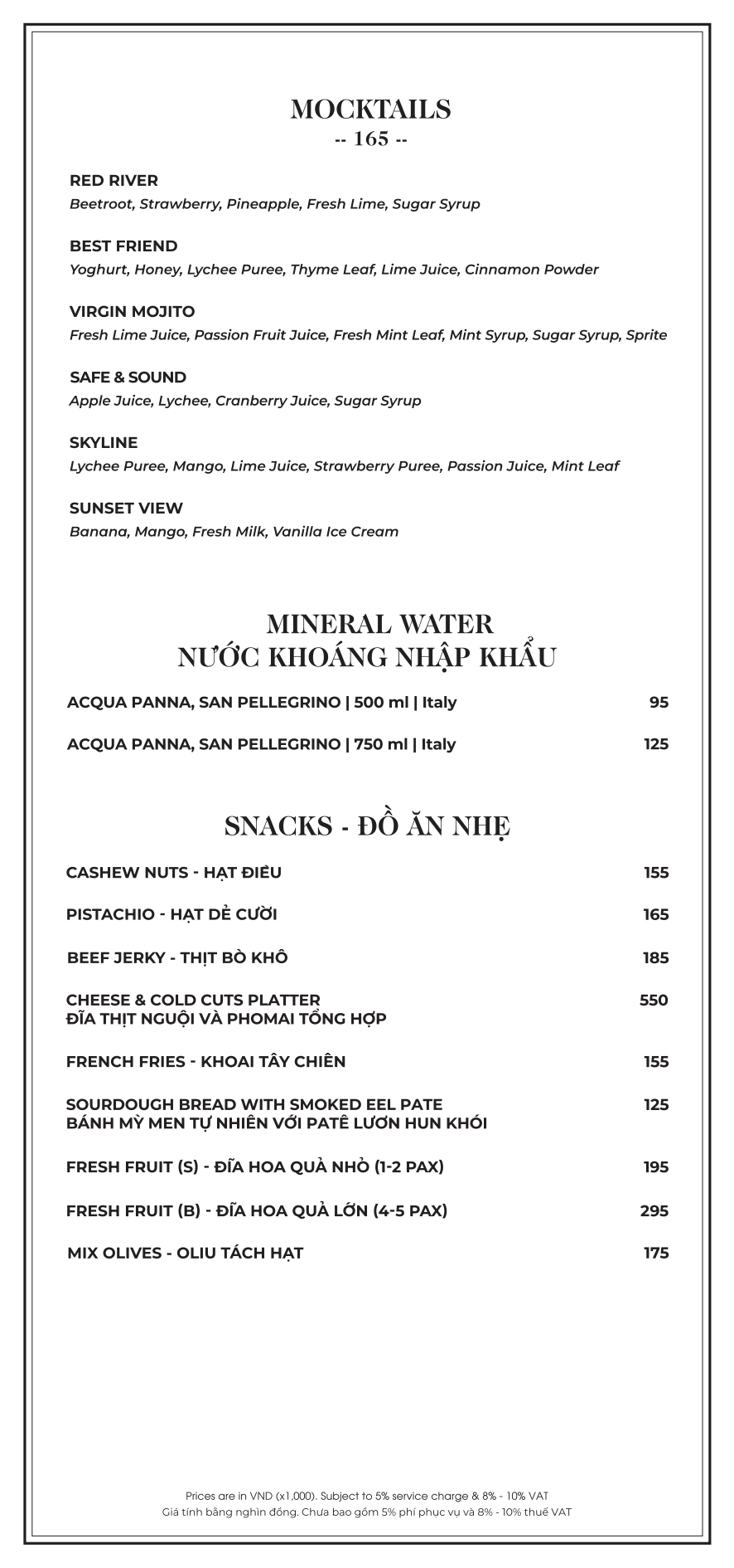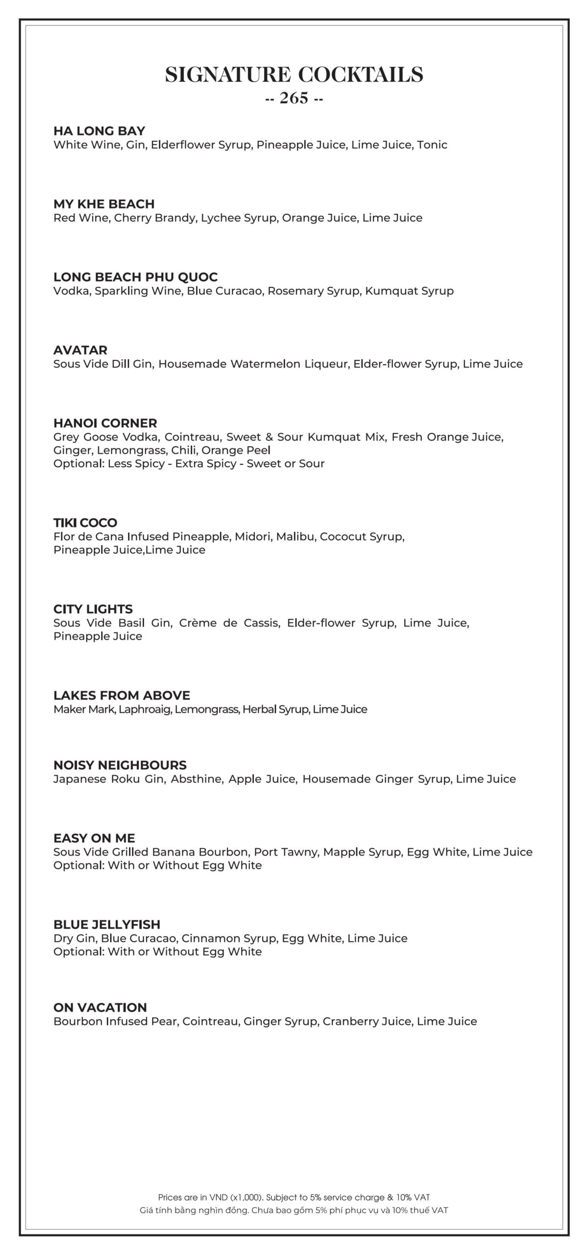 Bar Đinh mang đến những ly cocktail đặc trưng được pha chế tinh xảo, rượu hảo hạng và các món ăn nhẹ đầy sáng tạo.Dù là nhâm nhi một ly mojito lúc hoàng hôn hay thưởng thức old-fashioned dưới bầu trời sao, từng chi tiết đều được chăm chút để tạo nên một đêm khó quên.